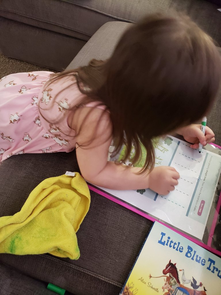 - *Bonus* I plan to homeschool in the future, so we’ve been practicing line tracing, lately. You can find some activities on Pinterest, but I also picked up a Preschool workbook, from Aldi’s, a few weeks back. I make copies (since I have 2 littles) and place it in a dry erase pocket I purchased from Target while back-to-school shopping, last year.